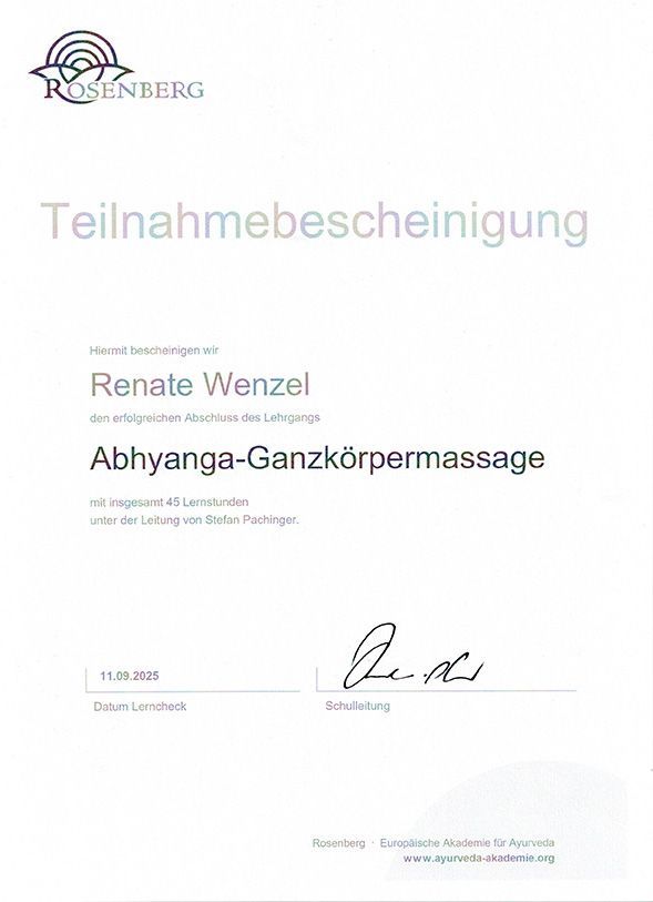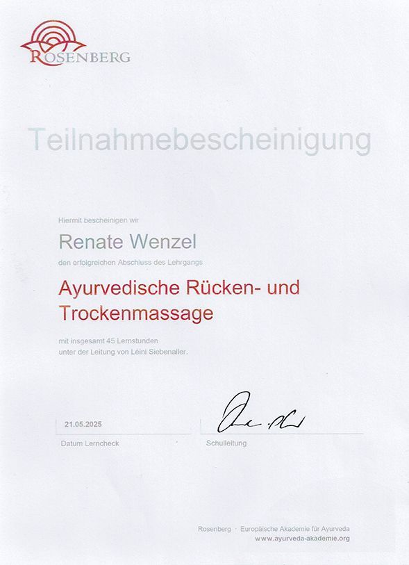 Ayurvedische Massagen sind Massagen, welche als erstes den Körper berühren, die Berührungen gehen über die Haut in die Seele und den Geist. Mehr als eine Massage, Streicheleinheiten für die Seele. Bei diesen Massagen entsteht ein tiefes Geborgensein, Angenommensein, Entspannen und Loslassen.